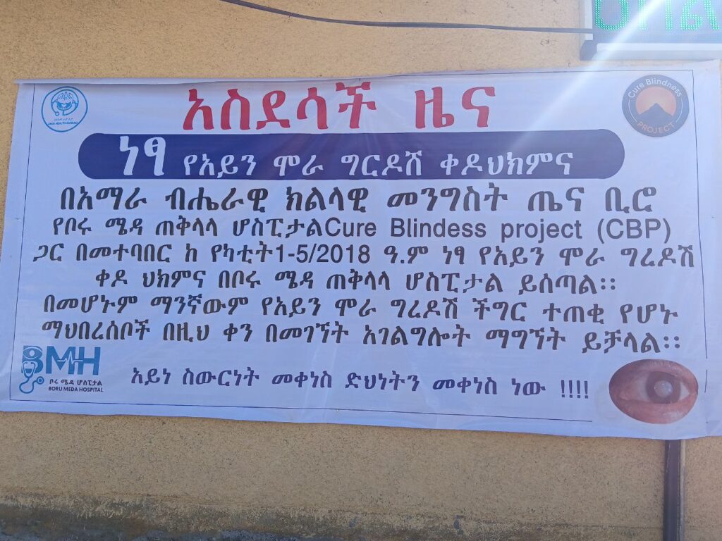 የቦሩ ሜዳ ጠቅላላ ሆስፒታል ኪዩር ብላይንድነስ ፕሮጀክት ከሚባል ግብረ ሠናይ ድርጅት ጋር በመተባበር ከየካቲት 1 ቀን/2018 ዓ ም ጀምሮ ለአምስት ቀናት ያህል የዓይን ሞራ ግርዶሽ ቀዶ ህክምና እና ከዚሁ በተጓዳኝም ከካርተር ሴንተር ጋር በመሆን የዓይን ቆብ ፀጉር መቀልበስ ቀዶ ህክምና በነጻ እየሰጠ ሲሆን በዚህ የህክምና አገልግሎት እስከ አንድ ሽህ አምስት መቶ የሚሆኑ ታካሚዎች ተጠቃሚ ይሆናሉ ተብሎ ይጠበቃል ።
